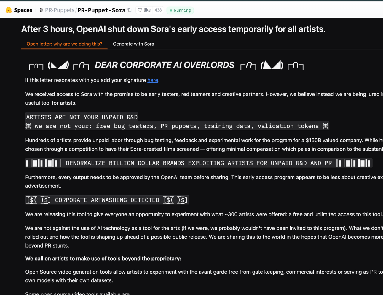 Image Source: Hugging Face/PR-Puppets/PR-Puppet-Sora/“Dear Corporate AI Overlords”/Screenshot